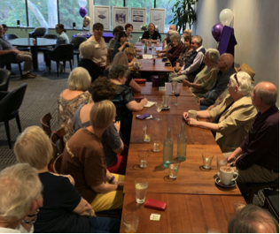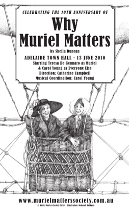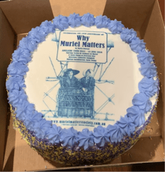 The Muriel Matters Society Inc. has launched its new tea towel! For the occasion The Society got together at the Bridgeway Hotel in Pooraka over tea and coffee – a balloon themed cake was served for afternoon tea. The new tea towel celebrates the 10th Anniversary of the performance of The Society’s play ‘Why Muriel Matters’ at the Adelaide Town Hall where Muriel appeared on the same day 100 years ago. Thanks to Deborah Baldassi for the wonderful illustration for this year’s design. Purchase the tea towel via The Society’s website and you can also look out for it at future events!