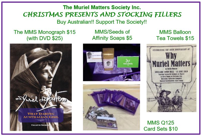 Can’t think of something to buy for friends or family? How about looking at our Merchandise Page for some gift ideas!! For anyone passionate about women’s history there are many presents available – including the new MMS Monograph ‘That Daring Australian Girl’ by Dr Collette Snowden. Any purchase is also for a good cause: all profits from this fundraising activity go back into The Society so that it can continue its important work.