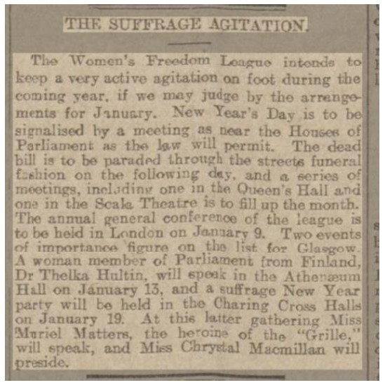 In the meantime, here is a newspaper article from the Aberdeen Journal telling of how the Women’s Freedom League was to keep up the pressure for suffrage as 1908 turned into 1909. Muriel was even set to speak at its New Year’s Party!