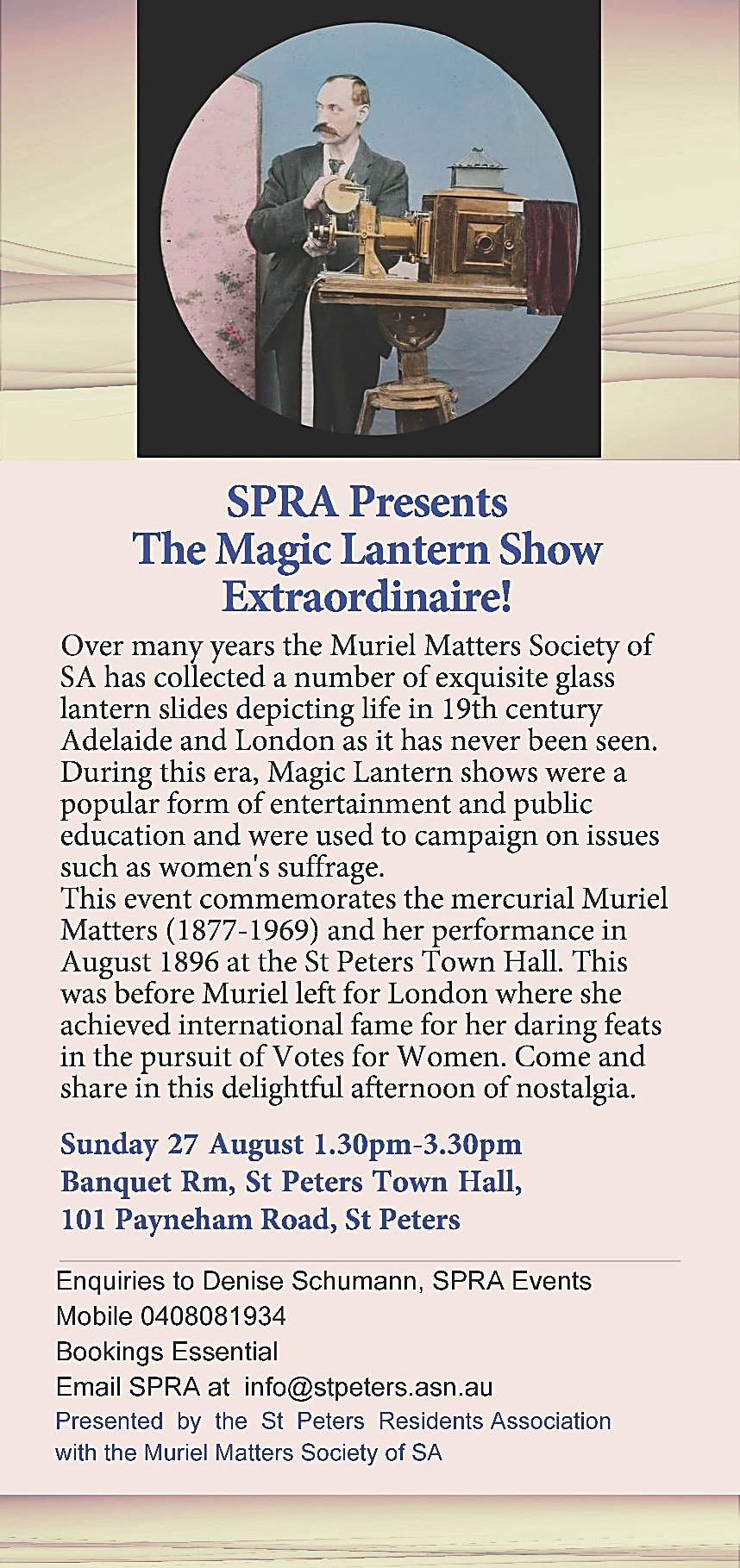 Adelaide · Events Event: 27 August 2023 – The Magic Lantern Show July 30, 2023September 25, 2024 Muriel Matters Society MMS is collaborating with the St Peter’s Residents’ Association for what will be a very special outing for our Magic Lantern, following the acclaimed Early Balloon Show.